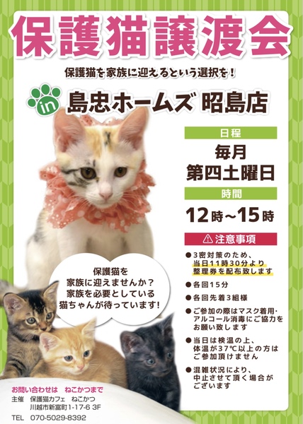 | イベント内容 | 毎月第4土曜日に、保護猫カフェ「ねこかつ」主催の譲渡会を開催しています。 子猫から成猫まで沢山の猫達が参加予定です。 【注意事項】 ・3密対策のため、当日11時30分より整理券を配布いたします。 ・各回先着3組様、15分間ご入場いただけます。 ・マスク着用、アルコール消毒のご協力をお願いいたします。 ・当日は検温の上、体温が37℃以上の方はご参加いただけません。 ⌒*。*゚*⌒*゚*。*⌒*。*゚*⌒* ゚*。*⌒*。*゚ 店舗には、ご寄付ボックスを常設していただいています。 こちらへ入れられたご支援品は、保護猫達の為に使わせていただきます。 何卒よろしくお願いいたします。 ⌒*。*゚*⌒*゚*。*⌒*。*゚*⌒* ゚*。*⌒*。*゚ たくさんの素敵なご縁がありますように♪ お問い合わせは下記まで♪ ーーーーー 保護猫カフェねこかつ Tel:070-5029-8392 ーーーーー |