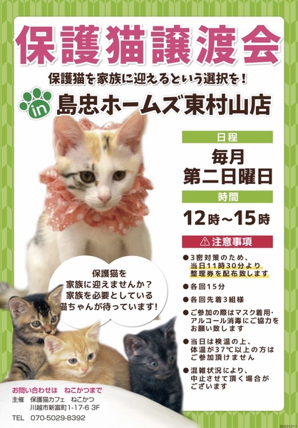 | イベント内容 | 毎月第二日曜日に、保護猫カフェ「ねこかつ」主催の譲渡会を開催しています。 子猫から成猫まで沢山の猫達が参加予定です。 【注意事項】 ・3密対策のため、当日11時30分より整理券を配布いたします。 ・各回先着3組様、15分間ご入場いただけます。 ・マスク着用、アルコール消毒のご協力をお願いいたします。 ・当日は検温の上、体温が37℃以上の方はご参加いただけません。 ⌒*。*゚*⌒*゚*。*⌒*。*゚*⌒* ゚*。*⌒*。*゚ 店舗には、ご寄付ボックスを常設していただいています。 こちらへ入れられたご支援品は、保護猫達の為に使わせていただきます。 何卒よろしくお願いいたします。 ⌒*。*゚*⌒*゚*。*⌒*。*゚*⌒* ゚*。*⌒*。*゚ たくさんの素敵なご縁がありますように♪ お問い合わせは下記まで♪ ーーーーー 保護猫カフェねこかつ Tel:070-5029-8392 ーーーーー |