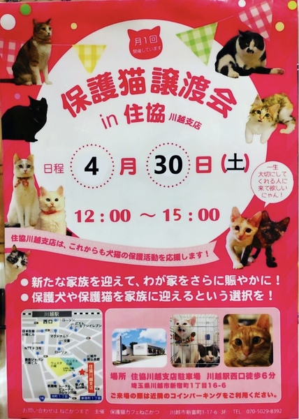 | イベント内容 | 毎月1回、保護猫カフェ「ねこかつ」主催の譲渡会を開催しています。 子猫から成猫まで沢山の猫達が参加予定です。 【注意事項】 ・マスク着用、アルコール消毒のご協力をお願いいたします。 ・雨天の場合は室内に変更となります。 ・お車でお越しの場合は近隣のコインパーキングをご利用下さい。 たくさんの素敵なご縁がありますように♪ お問い合わせは下記まで ーーーーー 保護猫カフェねこかつ Tel:070-5029-8392 ーーーーー |