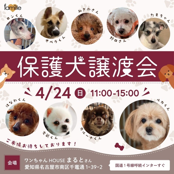 | イベント内容 | 4/24(日)ファミーユ譲渡会を開催します! https://ameblo.jp/npo-famille-nagoya/entry-12732382026.html 星呼続インターすぐ(1号線沿) 星駐車場完備 星バザーも開催いたします 星室内開催です 星お見合い希望の方は、「○○ちゃん・予約アンケート希望」とお書き添えの上メールでご予約いただくとスムーズです info@npo-famille.org ※ご注意 コロナでの混雑防止のため、アンケート済みでお見合い時間の予約をされてる方を優先させていただきます。 なお、アンケートはご希望の子がお決まりの方にお願いしております。 内容には個人情報も含まれますので 会ってから検討されたい方は会場にてご記入いただいております。その際はご予約不要です。 混雑状況によりましては、順次ご案内となることもございますがご理解とご協力をお願い申し上げます。 また譲渡会でのお見合い希望のご連絡は前日の16時までにお願い致します。 申し訳ございませんが、それ以降は対応出来かねます。 なお、スタッフは仕事をしておりますので すぐにお返事ができません。 ご了承くださいませ?♂️ |