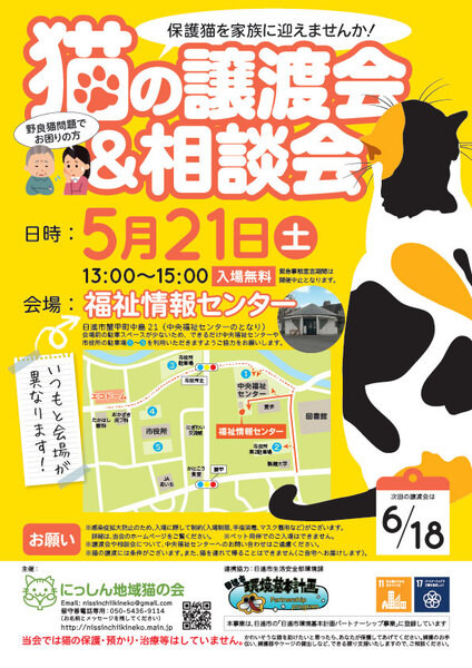 | イベント内容 | 5月21日(土)に「猫の譲渡会」を開催いたします。 猫少なめのミニ譲渡会&相談会です。 保護猫を迎えたい方はもちろん、ご近所との猫トラブルなどでお悩みの方もお立ち寄りください!(^^)/ 今回はいつもと会場が異なりまして、市内在住の方でも「そんなところにそんな建物があったの!?」とびっくりされること請け合い、秘密基地のような(?)とんがり屋根のかわいい建物です。ぜひお越しください! 【日時】2022年5月21日(土)13:00〜15:00 【会場】福祉情報センター(中央福祉センターとなり) 【主催】にっしん地域猫の会 【ホームページ】http://nissinchiikineko.main.jp ※緊急事態宣言中は開催中止となります。また、感染症拡大防止のため、入場に際して制約がございますので、ご理解・ご協力をお願いいたします。 ※会場前に駐車場がございますが、数が少ないため、満車時は中央福祉センターか日進市役所の駐車場をご利用ください。 ※新型コロナウイルス感染症拡大防止のため、入場に際して次のお願いごと(受付名簿のご記入、マスク着用、手指の消毒など)がございますので、ご理解・ご協力をお願いいたします。 ※会場内滞在人数に制限があるため、屋外でお待ちいただく場合がございます。 ※室内換気のため冷房・暖房が効きにくい場合がございます。 ※ペット同伴のご入場はできませんので、予めご了承ください。 ※譲渡会に関しまして、福祉センターへのお問い合わせはご遠慮ください。 ※猫ちゃんのトライアル/譲渡の条件、また、猫を保護された方で譲渡会に参加ご希望の方など、詳細はホームページをご覧ください。 |