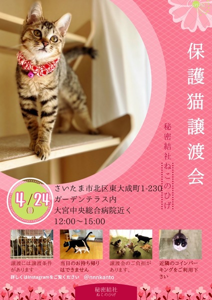 | イベント内容 | 今度の日曜日!4月24日は! 秘密結社ねこのひげ保護猫譲渡会♪ ✼••┈┈••✼••┈┈••✼ 埼玉県さいたま市北区東大成町1-230 ガーデンテラス内 開催時間12:00~15:00 ✼••┈┈••✼••┈┈••✼ 仔猫入居が始まりましたが お披露目はもう少し先なので。。 今はまだ♪ 若猫やオトナ猫たちと出逢える チャンスターーーイム!! モフっとした仔が おうちの床に落ちてたら ステキすぎる…♡ 魅惑のお腹を吸い放題なんて…♡ お膝の上に乗られて 身動きとれなくなりたい…♡ と、 妄想が止まらない方のご来場を 心からお待ちしてます♪ ワク♪o(・ω・o)(o・ω・)oテカ♪ ●参加メンバー(インスタ) @chotocha @charopondaifuku @nanashin.3 @miko_manma 夜なべ物販も開催します♪ @yonayona2222 お気軽にお立ち寄り下さいませ☆ |