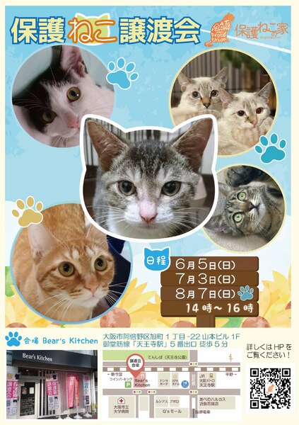 | イベント内容 | 毎月第1日曜 14時~16時まで【保護ねこの家 譲渡会】を開催しています。 会場は、大阪メトロ「天王寺駅」から徒歩5分と好立地。 交通の便が良く、会場横にはコインパーキングもあり大変便利です。 また、同日同時刻に【保護ねこの家 オンライン譲渡会】も開催しています。 子猫から大人猫までたくさんの保護猫たちが参加いたします。 是非、会場まで足をお運びください。 ▪日時 毎月第1日曜 14時~16時 ▪会場 Bear's Kitchen 大阪市阿倍野区旭町1丁目1-22 ▪交通機関 JR・大阪メトロ・近鉄線・阪堺線 ▪アクセス 大阪メトロ 天王寺駅 5番出口 西へ徒歩5分 会場横にコインパーキングあり ▪参加費 無料 ▪参加条件 なし(予約や事前エントリーなど不要) ▪参加猫 https://ameblo.jp/hogonekonoie/theme-10113553723.html ▪お問合せ ホームページ「お問い合せフォーム」より https://www.hogonekonoie.jp/ask/ ▾詳細情報 https://www.hogonekonoie.jp/jotokai/ |