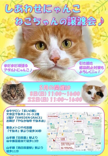 | イベント内容 | 「しあわせにゃんこ」は行き場のない猫ちゃんと里親様との 出逢いの場を提供するグループです♪ 子猫も成猫もハンデのある猫もみんな新しい家族を待っています♪ みなさまのご来場を保護主、スタッフ一同心よりお待ちしております♪ 開催にあたり感染対策として各種制限等を設けております。 ※詳しくはホームページ譲渡会情報をご確認願います。 http://www.shiawasenyanko.net/jyoutokai.html まだまだアダルトにゃんこの魅力炸裂の開催です! ちびにゃんにはない大人な余裕(笑)は必見です♪ ◆開催日/開催時間◆ 2022年5月22日(日) 11:00~16:00 感染者数の状況により開催の可否を判断させて頂きます。 ご希望の猫ちゃんがいらっしゃる場合は11時30分までに受付をお願い致します。 複数のお申し込みがある場合は11時30分で受付を終了させて頂く場合がございます。 受付をされた全ての里親様とお見合いをさせて頂きます。 ※先着順ではございません。 ※当日、猫ちゃんを連れて帰ることは出来ません。 後日調整のうえ保護主が里親様宅へお届けいたします。 ◆会場◆ ※新会場にてリニューアル開催です♪ 東京都文京区千駄木2-31-3 1階が北欧雑貨ショップ「SWEDENGRACE」 2階が谷中サロン「まいの間」 ※詳しいアクセスはホームページ案内図をご覧下さい http://www.shiawasenyanko.net/mapmainoma.pdf 谷中サロン「まいの間」の情報はこちら http://neko-to-kyo.com/#maima ◆交通手段◆ 東京メトロ千代田線「千駄木」駅より徒30秒 JR山手線「西日暮里」駅より徒歩11分 JR山手線「日暮里」駅より谷中銀座経由で徒歩13分 ※お車でご来場の際、駐車場のご用意はございません。 近隣のコインパーキング等をご利用ください。※近隣に沢山あります。 いつ里の掲載参加猫一覧はこちらから https://satoya-boshu.net/mypage/foster_list.php?@ps@=none アメーバブログの里親募集にゃんこはこちら https://ameblo.jp/shiawasenyan-ko/theme-10092719565.html ◆猫ちゃんとのお見合い◆ 掲載している猫ちゃんは基本的に譲渡会場でのお見合いのみとなります。 譲渡会への参加が決定している猫ちゃんはその譲渡会で里親様が決定しなかった場合のみ保護主宅でのお見合いが可能となります。 自宅お見合いを希望される里親様はメール(info@shiawasenyanko.net)にてご相談ください。 ◆当譲渡会では猫ちゃんと里親様のスキンシップを大切にしています◆ 新しい家族として20年以上いっしょに暮らしていく猫ちゃんです。 譲渡会場でたくさんの猫ちゃんと触れ合って良きパートナーを見つけてください。 はじめて猫ちゃんを迎える不安や先住猫ちゃんとのトライアルの注意点、猫ちゃんと里親様の暮らし方など気軽にご相談ください。 経験豊富な保護主や猫大好きスタッフがアドバイスさせていただきます。 ◆子猫ご希望の里親様◆ 子猫は急な下痢や発熱等により体調が急変し、数時間対応ができなかっただけでも命を落とす事があります。 その為、当譲渡会では月齢によりお留守番のない又は少ないご家庭への譲渡に限らせて頂いております。 また里親様と子猫ちゃんが安心してトライアル期間を過ごせるよう体重が1㎏程になってからのお届けとさせて頂いております。 ◆里親希望のみなさまへ◆ ご家族の皆様で生涯、家族の一員としてたっぷり愛情を注いでくださるご家庭をお待ちしております。 下記に該当する希望者様へ ・独身、単身者の方 ・友人同士、同棲でのお住まいの方 ・高齢者のみのご家庭の方 は、ご相談の上、譲渡を判断させて頂きます ・適正飼育の不可能な方 ・脱走防止対策を考えて頂けない方 ・定期報告の不可能な方 は、ご遠慮下さいますようお願い致します ◆ご負担頂く費用について◆ 譲渡の際に譲渡負担金(医療費の一部、譲渡金、お届け時の交通費)を里親様にご負担頂く事により 過酷な状況にいる猫ちゃんを保護し新しいご家族の元へ送り出す事ができています。 皆様のご理解とご協力にボランティア一同、心より感謝しております。 ご負担頂く医療費につきましてはホームページに詳しく記載させて頂いております。 http://www.shiawasenyanko.net/onegai.html しあわせにゃんこホームページ http://www.shiawasenyanko.net メールでのお問い合わせ info@shiawasenyanko.net |