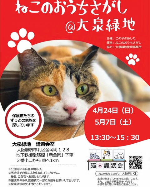 | イベント内容 | 広い会場ですので、密にならずじっくり保護猫ちゃんたちとお見合いしていただけます♪ 参加猫情報は、下記のブログにて順次ご紹介していきます^ ^ https://ameblo.jp/jillrill/theme-10113120111.html ※感染拡大の状況によっては急遽中止となる場合がございます。 ※ご来場の際は必ずマスク着用をお願いいたします。 ※開催時間中、定期的に空間中に消毒液を噴霧いたしますので、あらかじめご了承ください。(無害です) 第11回☆ねこのおうちさがし@大泉緑地 日時 : 2022年5月7日(土) 時間 : 13:30〜15:30 場所 : 大泉緑地 講習会室 〒591-8022 大阪府堺市北区金岡町128 地下鉄御堂筋線「新金岡」2番出口より東へ1km ☆公園内に有料のコインパーキングがございます。 (第1駐車場が会場に一番近いです) ☆会場へのお問い合わせは固くお断りします。 (場所をご提供くださるだけなので、参加猫のについてはご存知ありません) ★譲渡には完全室内飼育、同意書への署名・捺印などの条件、医療費の一部負担があります。 ★猫ちゃんは、後日お届けとなります。 当日連れて帰ることはできません。 ★参加予定の猫ちゃんは、里親会の前に里親さまが決定する場合や、体調により不参加となる場合があります。 主催:この子のあした 運営:ねこのおうちさがし 協力:大泉緑地 問い合わせ先 : poptoy_r☆☆☆yahoo.co.jp (☆☆☆を@に変更してください) ※スジュールにより来場できないけど気になる子がいらっしゃる場合、お問い合わせ頂きましたら、アンケートにお答え頂いたのち保護主さんにお繋ぎいたします。 |