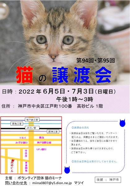 | イベント内容 | 保護された猫たちが参加して、新しいお家を求めて参加します(=^・^=) 猫は後日こちらからお届けをさせて頂き、お家の環境を見せて頂ければと思います。 猫は20年くらい生きる子もいますので、ご自身の年齢に合った猫さんとの出会いを探しに来てください。 ペット不可にお住まいの方はご遠慮ください! 譲渡には条件が多数ありますので、ご理解くださいませ<m(__)m>。 まずはお試しで猫との相性を見てから、正式譲渡となります。 また、猫を参加させたい方も、募集いたします。 アドレス miina0807@y5.dion.ne.jp にご連絡をください。 お越しの際は各路線の三宮駅からは徒歩10分くらい、車でお越しの場合は近隣のコインパーキングなどにお停めください。 当日、体調の悪い方、発熱がある方、このような方はご遠慮ください。 こちらでは、体温チェックや消毒をし、万全を期しております。 密にならないように、人数制限をしておりますので、お待ち頂く場合があります。 ブログ: 猫のミーナといっしょ http://miina300.blog.fc2.com/ ねこのオカン |