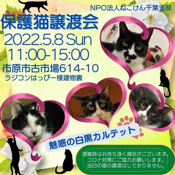 | イベント内容 | 子猫から大人猫まで、沢山の保護猫達が譲渡会に参加します♪ 通常スタイルの譲渡会と致しますが、コロナウイルス対策として ・会場内ではマスクのご着用と入退室の際は消毒をお願い致します。 ・ご予約無しでお越しいただけますが、混雑時は整理券を配らせていただきます。 ご協力の程よろしくお願い致します。 成猫は指名制のお見合いとさせていただく子もおりますので、 『◯◯ちゃんと、お見合い希望』とご指名の事前申し込みをお願い致します。 ねこけん千葉支部のブログ内にありますお問い合わせフォームより、 ⚫︎お名前 ⚫︎ご住所(市区町村までで大丈夫です) ⚫︎お見合いご指名猫の名前を、お知らせください。 ※締め切りは譲渡会前日5月7日(土)18時までとなっております。 ねこけん千葉支部ブログ→ https://ameblo.jp/nekoken-chiba/ また、譲渡会会場では、千葉県内にお住いの預かりボランティアさん及びお世話ボランティアさんを募集しています。 ご希望の方は、大変お手数をおかけしますが、譲渡会までお越しください。 ※ご都合がつかない場合は、お問い合わせ先までご相談ください。 [日時] 5月8日(日)11:00~15:00 [会場] 千葉県市原市古市場614-10 ※屋内での開催となり雨天決行です。 ※抱っこもOK! ※猫ちゃんの負担も考え、ご来場は時間内にお願い致します。 ※特にご予約などは必要ございませんのでご家族皆様でぜひお越し下さい。 ※駐車場あり。 [交通] 交通機関を利用してお越しの方 JR内房線 浜野駅より徒歩13分 浜野駅は、東京駅から京葉線→内房線でおよそ50分の距離!! お車でお越しの方 京葉道路蘇我インターより車で10分 ※駐車場はラジコンショップハッピー様裏手にございます駐車場をご利用ください [譲渡ご希望の方へのお願い] 誠に恐れ入りますが下記に当てはまります方への譲渡は不可となりますので予めご了承下さい。 ①学生さん、未成年の方、安定収入のない方 ②ペットを飼う事を許されていない住宅にお住まいの方 ③身体的、精神的疾病で治療中の方 ※60歳以上の方は別途条件がございますのでご相談下さい。 [譲渡の流れ] お申込み→審査→後日お届け→トライアル→正式譲渡 ※当日のお連れ帰りは出来ませんので予めご了承ください。 ※仮譲渡時にご希望の猫ちゃんにかかった医療費(血液検査・ワクチン・駆虫・不妊去勢手術等)をご負担願います。 しかし、正式譲渡に至らなかった場合は医療費を全額返済致します。 [主催] 動物愛護団体 NPO法人ねこけん 千葉支部 [ブログ] https://ameblo.jp/nekoken-chiba/ [参加動物] 成猫・子猫(ねこけん保護猫以外の猫ちゃんも参加予定です) [お問い合わせ] ご不明な点、ご質問等ございましたら下記までお問い合わせください。 chiba.info@nekoken.jp |