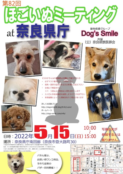 | イベント内容 | 5月15日(日曜日)、奈良県庁(奈良市)の南側回廊部分にて「第82回ほごいぬミーティングat奈良県庁」を開催します。 保護犬を家族に迎えようと考えている方、保護犬に会ってみたい方、保護犬について知りたい方、ぜひご来場ください。 相性を見るためなど先住わんこさん、卒業わんこさんのご参加ももちろんOKです。 当日は、Dog's smileグッズやワンコ用品の販売、Dog's smileを応援してくださる方々が手作りされた手作り雑貨などの販売も行います。どれもお買い得です。 また、売り上げは、私たちの活動資金になります。ぜひご協力をお願いします。 来場者のみなさまには、コロナウイルス感染拡大防止に御協力をお願いします。 ・必ずマスクを着用の上、御来場ください。 ・発熱・風邪の症状のある方の入場は御遠慮願います。 ・入口にて検温を行い、37.5℃以上の場合は、入場をお断りします。 ・入場時は、手指消毒への御協力をお願いします。 ・来場者の状況により、入場制限を行う場合があります。 なお、来場予定のワンコについては、活動ブログでご確認ください。 日時 令和4年5月15日(日)午前10時~午後3時 場所 奈良県庁 南側回廊部分 奈良市登大路町30 (近鉄奈良駅から東に徒歩6分、JR奈良駅から市内循環バス外回りに乗り県庁前バス停降りてすぐ) 協力 公益社団法人奈良県獣医師会、奈良県 |