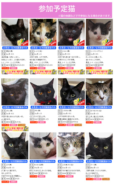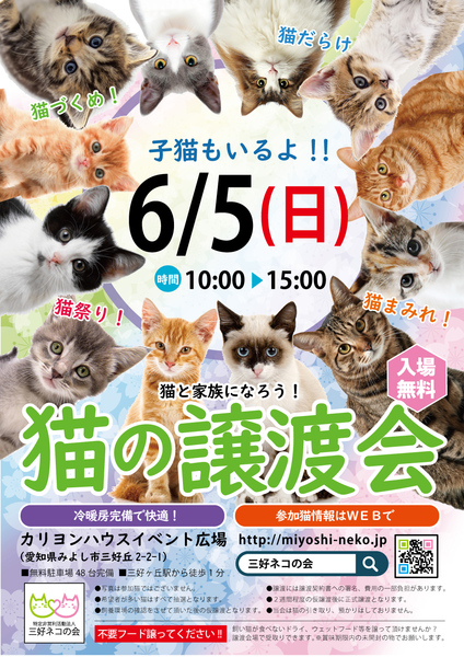 | イベント内容 | 子猫含む12匹が参加予定の譲渡会! 2ヵ月の子猫参加します!! 猫に触れ合って抱っこして楽しい時間を過ごしませんか? 新しい家族になる猫に出会えるかも!? http://miyoshineko.sblo.jp/article/189563047.html ●ねこねこまみれ(=^・^=) 6月5日(日)/10時~15時 三好ヶ丘カリヨンハウスイベント広場(屋内会場) 愛知県みよし市三好丘2-2-1 ※無料駐車場48台、三好ヶ丘駅から徒歩1分 ※来場者多数の場合は入場制限を行う場合があります。 ●譲渡までの流れ及び譲渡手数料 <三好ネコの会保護猫> http://miyoshineko.sblo.jp/article/187085341.html <個人の保護猫> 保護主様によって譲渡基準、手数料、ワクチン代、治療費が異なります 譲渡会場でご確認ください。 ------------- ■amazon欲しいものリストからご支援お願いします。 https://www.amazon.co.jp/hz/wishlist/ls/2ISUJLV6D472X?ref_=wl_share ■主催:NPO法人三好ネコの会 http://miyoshi-neko.jp |