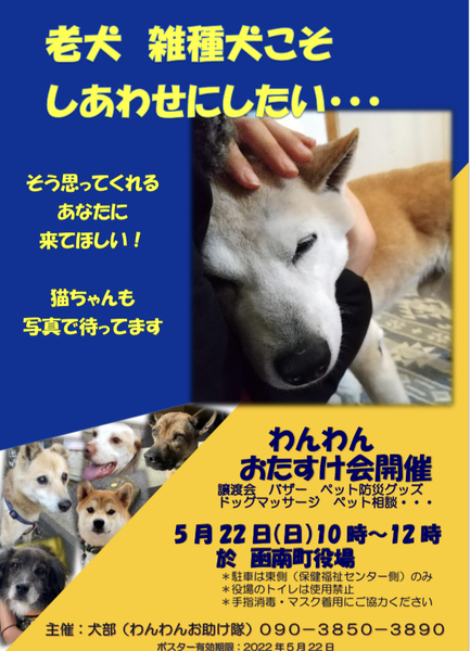 | イベント内容 | 【5月わんわんおたすけ会のご案内】5月わんわんおたすけ会(譲渡会)は、 5月22日(日)10時〜12時 函南町役場(静岡県田方郡函南町平井717-13) にて開催します。 犬部わんわんお助け隊とセラピードッグサポートクラブさんの里親募集中のワンコたちも参加します。 中大型犬、MIX犬、シニア犬ばかりです(若いワンコもいます!)。人気の小型犬の純血種はいませんが、MIX犬、シニア犬には唯一無二の表情や穏やかさがあります。犬種にこだわらず、その犬の個性を大切にして迎えいれて下さる方に出会えることを願っています。 特にシニア犬は家族に迎え入れて下さる方が非常に少ないのが現状です。一緒に過ごせる時間が短い、介護生活が目前と思うと当然かと思います。ただ本当の優しい家族とさいごまで穏やかに過ごす幸せを味合わせてあげたい。また、一頭迎え入れていただければ、ボランティアにも少し余裕ができ、現在命の危険にさらされている一頭をボランティアが助けることができます。そのような命のリレーを地元で繋いでいきたいと願います。 ぜひワンコたちに会いにきてください。里親募集の保護ネコたちはポスターで参加します。ネコちゃんもよろしくお願いします。 チャリティバザーでお買い物をしてのご支援もぜひお願いします!!犬用品やアクセサリーなど、すてきなバザー品たくさんです。ペット防災についての啓発やドッグマッサージもあります!マッサージをしてもらいたい愛犬がいたら一緒に連れてきてください。 5月わんわんおたすけ会もよろしくお願いします。 以前のわんわん通信のコラム【老犬を保護するということ】もぜひ読み返していただけたら嬉しいです。https://inubuwanwanotasuke.wixsite.com/keihatsu/column-2018-11 犬部わんわんお助け隊ブログ https://ameblo.jp/inubu11/ |