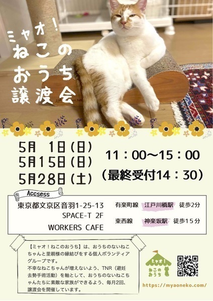 | イベント内容 | 参加する保護猫ちゃんについては、譲渡会一週間前からホームページにてご紹介しております。 https://myaoneko.com 事前予約はできません。 猫ちゃんをお世話することになるご家族皆様でお越しくださると嬉しいです。 譲渡会場でお会いしましょう♪ 【新型コロナウイルス対策について】 会場受付にて、以下の点をお願いする予定です。 ✿マスクの着用 ✿手洗いと消毒 ✿連絡先のご記入 御来場者多数の場合には入場制限を設けさせていただきます。 ※当日沢山のご来場者様がいらっしゃった場合、 整理券をお渡しする事がございます。 会場外で長時間お待たせする場合もございますが ご理解くださいますようお願い致します。 皆さまの長時間の在室を避ける為、 希望者様へは後日のご連絡とさせて頂きます。 ※ 感染防止対策時の特例となります。 ◇譲渡に関してのお願い 【ミャオ!ねこのおうち】では譲渡に際して、以下の要件をお願いしております。 ・完全室内飼いで終生愛育 ・脱走させないための対策 ・不妊去勢手術 ・譲渡誓約書の取り交わし ・医療費の一部ご負担 ※60才以上の方のみのご家庭、独身や、経済的に困難な世帯、 必要な脱走対策を施していただけない方には原則的に譲渡はご遠慮頂いております。 また、保護主により譲渡条件が異なる場合もございますので会場でご相談ください。 参加予定ねこちゃんは、急な体調不良などで不参加になる場合もございます。 【譲渡に関してのお願い】・【医療費の一部のご負担】・【譲渡までの流れ】など 詳しくは下記ホームページをご覧くださいますよう宜しくお願い致します。 ミャオ!ねこのおうち譲渡会 ホームページ https://myaoneko.com |