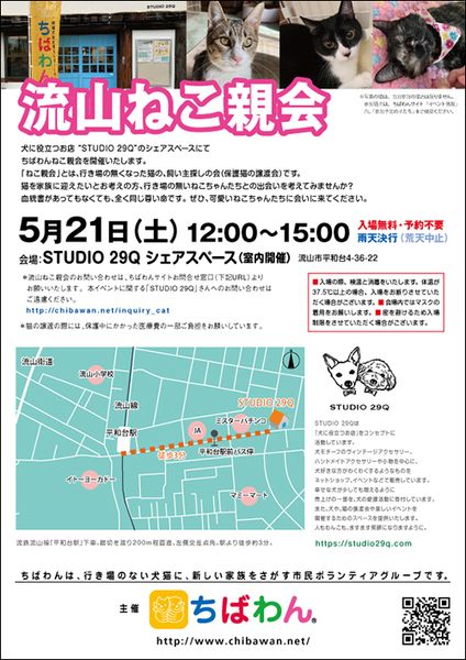 | イベント内容 | 千葉県流山市のSTUDIO 29Q シェアスペースをお借りして、ねこ親会を開催します! 是非かわいい猫に会いに来てくださいね♪ 詳細はこちらからどうぞ→https://chibawan.net/eventcat/eventngycat 【新型コロナウィルス感染予防のため、ちばわんからのお願い】 ①会場内ではマスクの着用をお願いします。 ②入場の際、検温と消毒をお願いします。体温が37.5℃以上の場合、入場をお断りする場合があります。 ③ご予約は不要ですが密を避けるため入場制限をさせていただく場合があります。 2022年5月21日(土)12:00〜15:00 STUDIO 29Q シェアスペース 千葉県流山市平和台4-36-22 流鉄流山線「平和台駅」下車。踏切を渡り200m程直進、左側交差点角。駅より徒歩約3分。 駐車場はございません。当日お車の方は近隣のコインパーキングをご利用ください。 【会場内でのお願い】 ・当日、会場内への犬猫等の愛玩動物の同伴は出来ません。 ・譲渡が決定した場合、後日猫をご自宅へお届けいたします。当日猫をお引渡しすることはございません。 【当日の流れ】 ①ご予約は不要ですが密を避けるため入場制限をさせていただく場合がございます。会場ではちばわんボランティアは名札をつけておりますのでどうぞご遠慮なくお声をおかけください。 また、募集中の猫のそばには預かりボランティアが控えておりますので遠慮なくご質問ください。 ②気に入った猫がいましたら、該当の預かりボランティアとお話しのうえ、「申し込みアンケート」にご記入ください。 (前日までにインターネットでアンケートを送信してお申し込みいただくこともできます) ◆「ねこ」アンケート送信先:【ねこ親】お申込みアンケート https://chibawan.net/contactform_cat ③アンケート内容を拝見し、アンケート担当者がお話しさせていただきます。 ④原則として一両日中に預かりボランティアからお返事の連絡をさせていただきます。 ⑤ご縁が成立した場合は後日、こちらからご自宅まで猫をお届けし、約1ヶ月のお試し生活に入っていただきます。 お届けの際に書面での譲渡契約書を交わします。 ※ワクチン・去勢不妊手術など保護ねこにかかった費用は家族になるねこ親様にもご負担をお願いしています。 【お願い】 ①ねこ親会・いぬ親会当日の飛び入り参加は受け付けておりません。 犬猫を保護した、飼い主を失った犬猫がいる、新しい家族を探したい犬猫がいるなどの場合は「こんな時どうする?」をお読みください。 ◆こんな時どうする?→https://chibawan.net/help/qacase ②会場は室内ですが、脱走逸走の恐れがあるため、猫はケージから出さないでください。 (ご希望の猫に触れてみたいなどのご希望がございましたらお近くのちばわんボランティアにお声をおかけください) ③参加する猫の中には臆病な性格の子がいます。お子様だけでの入場はご遠慮いただきます。お怪我防止のためにご理解ください。 今後も問題なくねこ親会を続けられるよう皆様のご協力をお願いいたします。 |