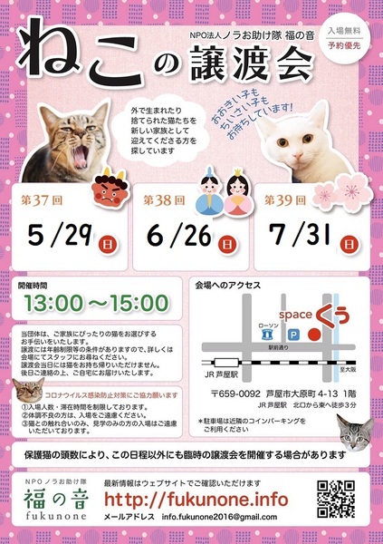 | イベント内容 | 保護された猫が参加して、新しいお家を求めて参加します(=^・^=) 猫は後日こちらからお届けをさせて頂き、お家の環境を見せて頂ければと思います。 猫は20年くらい生きる子もいますので、ご自身の年齢に合った猫さんとの出会いを探しに来てください。 ペット不可にお住まいの方はご遠慮ください!(ご確認ください) 仔猫の場合は、お留守番が長いお家には難しいですので、ご了承ください。 譲渡には条件が多数ありますので、ご理解くださいませ<m(__)m> 里親希望の方は予約優先でのご案内とさせて頂いております。。 ご予約は、アドレス miina0807@y5.dion.ne.jp にご連絡をください。 お越しの際はJR芦屋駅からは徒歩3分、車でお越しの場合は近隣にコインパーキングがあります。 当日、体調の悪い方、発熱がある方、このような方はご遠慮ください。 毎月、最終日曜日に開催予定にしておりますが、変更もありますのでご確認ください。 こちらでは、体温チェックや消毒をし、万全を期しております。 |