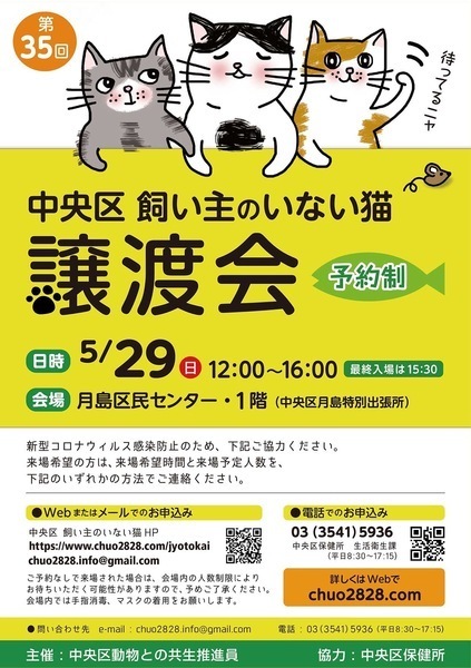 | イベント内容 | 中央区では様々な事情で飼い主のいないネコ達にずっとのおうちを見つけるために中央区動物との共生推進員が中心となって、譲渡会を定期開催しており今回で35回目を数えます。 区内の高齢者からの引き取りネコなど大人猫はもちろん、今春生まれの子猫、お留守が長くても子猫を迎えやすい親子ペアなども参加します。 子猫は月齢2ヶ月以上に成長し、健康状態に問題ないことが確認できると、譲渡会に参加できるようになりますが、まだまだ体調の急変もあるため、お留守番の多いご家庭への譲渡はご遠慮いただいておりますので、予めご了承のほどお願いいたします。 ネコとの暮らしをご希望されている方、ネコのお預り希望の方、またネコとの暮らしについて色々ご質問がおありになる方、皆様のご来場をお待ちしております。 ※里親を希望される方は、身分を証明できる物をご持参の上、当日会場まで直接お越し下さい。 会場内の混雑を防ぐため、事前に来場希望時間と来場予定人数をご連絡ください。 <譲渡会> 開催日:2022年5月29日(日曜日) 開催時間:12:00〜16:00(最終入場時間15:30) 会場:中央区月島区民センター 1階会議室 譲渡会の事前お申し込みはこちらから → https://www.chuo2828.com/jyotokai 里親さま募集中の猫ちゃんはこちら → https://www.chuo2828.com/catslist 参加猫の情報は、譲渡会の1週間前くらいにWebに掲載する予定です。 今回も1匹でも多くの猫さんたちに、新しい家族とのご縁が繋がりますように。 |