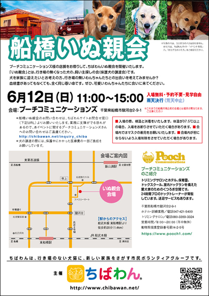 | イベント内容 | 6月船橋いぬ親会のご案内です。 poochさんのご厚意により、プーチコミュニケーションズ(船橋市駿河台)のドッグランをお借りして「船橋いぬ親会」を継続開催することになりました。 屋根付きのドッグランでの開催になります。 【ちばわんからのお願い】 ①会場内ではマスクの着用をお願いします。 ②入場の際、検温と消毒をいたします。体温が37.5℃以上の場合、入場をお断りさせていただく場合があります。 ③会場内が密にならないよう入場制限をさせていただく場合があります。 開催日:6月12日(日)11:00~15:00 屋外開催(屋根付きドッグラン) 小雨決行 場所:プーチコミュニケーションズ 千葉県船橋市駿河台2-9-1 【アクセス】 プーチコミュニケーションズ 飯山満駅から徒歩約20分 JR東船橋駅から徒歩約20分 県道8号線 吹上交差点~駿河台交差点間にあるファミリーマートの裏手になります。 リサイクルショップとファミリーマートの間の道へ進み、最初のT字路を左折してください。 ※店舗の駐車場は5台分のみとなりますので混雑時にはご利用いただけない場合がございます。 満車の場合はコインパーキングをご利用下さい。 《注意事項》 【当日の流れ】 (1)家族募集中のいぬとお会いになりたい方はどなたでも自由にご参加いただくことができます。ちばわんボランティアは名札をつけておりますので、ご遠慮なくお声をかけて下さい。また、募集中のいぬのそばには預かりボランティアが控えておりますのでいぬの性格や生活習慣など、遠慮なくご質問ください。 (2)ご希望のいぬが決まったら、お申し込みアンケートにご記入の上、ボランティアにお渡し下さい(前日までにメールでアンケートを送信してお申し込みいただくこともできます。) ◆「いぬ」アンケート送信先: http://chibawan.net/contactform_dog (3)アンケート内容を拝見し、お話させていただきます。 (4)原則として一両日中にお返事の連絡をさせていただきます。 (5)ご縁が成立した場合には、後日、こちらからご自宅までいぬをお届けし、約1ヶ月のお試し生活に入っていただきます。お届けの際に、書面での譲渡契約書を交わします。 ※ワクチン・不妊手術代など保護犬にかかった費用は、家族になるいぬ親さんにもご負担をお願いしています 《お知らせ》 ◆会場ではチャリティグッズを販売します 売上金は保護した犬猫の医療費など、 ちばわん活動費として大切に使わせていただきます 《お問い合わせ》 いぬ親会について:http://chibawan.net/inquiry_chiba ※いぬ親会当日はメールが見られません。また、お問い合わせの際は、必ず「具体的な件名」を入れて多数の迷惑メールと区別がつくようにお願いいたします。 ※本イベントに関するPoochさんへのお問い合わせはご遠慮ください。 船橋いぬ親会イベントホームページ https://chibawan.net/event/20220612-funabashi-dog ちばわんホームページ https://chibawan.net/ |