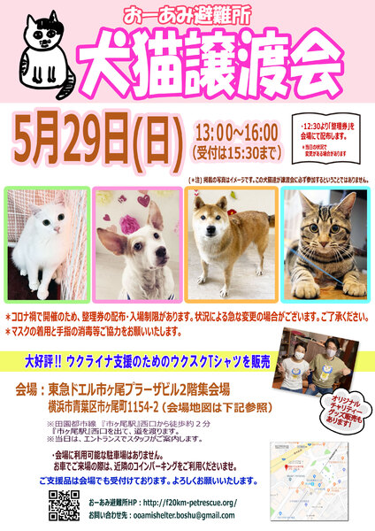 | イベント内容 | ☆★☆★☆★☆★☆★☆★☆★☆★☆★☆★☆ ~5月29日(日)市ヶ尾にて譲渡会開催!~ ◎場所・・「東急ドエル市ヶ尾プラーザビル2階集会場」 神奈川県横浜市青葉区市ヶ尾町1154-2 田園都市線「市ヶ尾」駅西口より徒歩約2分 ◎日程・・5月29日(日)(雨天決行) ◎時間・・13時から16時(受付は15時30分まで) (会場に利用可能な駐車場はございません。近隣のコインパーキングをご利用ください。) *3密対策のため、当日12時30分より全時間分の整理券を配布いたします。整理券枚数には限りがございますので、上限に達した場合はご入場できません。 *参加の際は、マスクの着用、アルコール消毒のご協力をお願いいたします。 *当日は検温の上、体温が37度以上の方はご参加いただけません。 *混雑状況により、中止させていただく場合がございます。 ※参加予定の犬猫は体調により参加できない場合があります。ご了承ください。 ☆★☆★☆★☆★☆★☆★☆★☆★☆★☆★☆ |