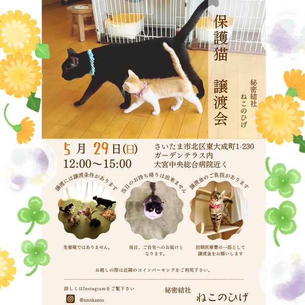 | イベント内容 | 今度の日曜日!5月29日は! 秘密結社ねこのひげ保護猫譲渡会♪ ✼••┈┈••✼••┈┈••✼ 埼玉県さいたま市北区東大成町1-230 ガーデンテラス内 開催時間12:00~15:00 ✼••┈┈••✼••┈┈••✼ 仔猫入居が始まりましたが 初期医療を終えてのお披露目はもう少し先なので。。 今はまだ♪ 若猫やオトナ猫たちと出逢える チャンスターーーイム!! モフっとした仔が おうちの床に落ちてたら ステキすぎる…♡ 魅惑のお腹を吸い放題なんて…♡ お膝の上に乗られて 身動きとれなくなりたい…♡ と、 妄想が止まらない方のご来場を 心からお待ちしてます♪ ワク♪o(・ω・o)(o・ω・)oテカ♪ ●参加メンバー(インスタ) @chotocha @charopondaifuku @nanashin.3 @miko_manma 夜なべ物販も開催します♪ @yonayona2222 お気軽にお立ち寄り下さいませ☆ |