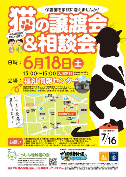 | イベント内容 | 6月18日(土)に「猫の譲渡会」を開催いたします。 猫少なめのミニ譲渡会&相談会です。 保護猫を迎えたい方はもちろん、ご近所との猫トラブルなどでお悩みの方もお気軽にお立ち寄りください!(^^)/ 緊急事態宣言中/まん延防止期間中は開催中止となります。 また、感染症拡大防止のため、入場に際して制約がございますので、ご理解・ご協力をお願いいたします。詳細は、ホームページにて随時更新いたします。 【日時】2022年6月18日(土)13:00〜15:00 【会場】福祉情報センター(中央福祉センターとなり) ※入場無料・予約不要です。 ※会場前に駐車場がございますが、数が少ないため、できる限り中央福祉センターか日進市役所の駐車場をご利用ください。図書館向かいにも市役所の臨時駐車場がございます。 ※ペット同伴のご入場はできませんので、予めご了承ください。 ※感染症拡大防止対策として、室外でお待ちいただく場合や室内換気のため冷暖房が効きにくいことがございます。 ※猫ちゃんの譲渡には条件がございます。詳細はホームページをご参照ください。 【主催】にっしん地域猫の会 【ホームページ】http://nissinchiikineko.main.jp |
