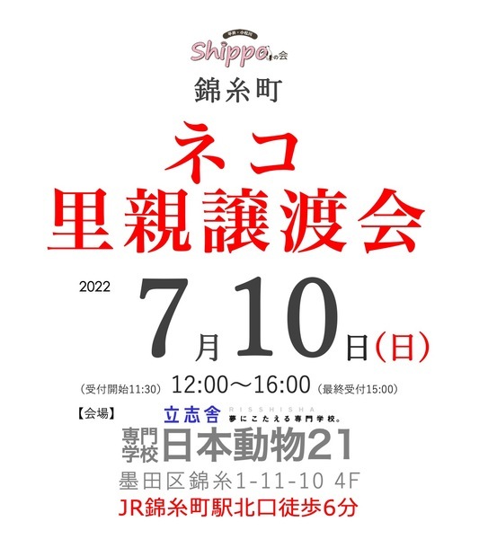 | イベント内容 | 東京 錦糸町の専門学校日本動物21様のご協力により、同校舎にて猫の里親譲渡会を開催させていただきます。 〘 お願い 〙 日本動物21様は譲渡会の会場をお貸して頂いているだけですので、里親会・お見合い等に関する一切の問い合わせは受け付けておりません。 ※日本動物21様への電話での問合せはご遠慮ください。 里親会・お見合い・譲渡・掲載している猫等など、全てのお問合せは当会までお願い致します。 hilakoma@yahoo.co.jp 参加猫さんはこちらからご覧下さい。(随時更新) https://www.pet-home.jp/member/user360938/post/ https://omusubi-pet.com/groups/193 ●日時:7月10日(日) 12:00~16:00 (入場受付11:30 最終受付15:00) ●会場:専門学校 日本動物21 墨田区錦糸1-11-10 4F ●アクセス:JR総武線・総武快速線「錦糸町駅」 北口徒歩6分/東京メトロ半蔵門線「錦糸町駅」 3出口徒歩6分 ※東京都墨田区錦糸1-2-1(アルカタワーズ)は同校の法人本部です。 里親譲渡会の会場ではございませんので、お間違いのないよう御願い致します。 感染対策として、ご来場の際は「マスク着用」「入り口でのアルコール消毒」「検温・アンケート・問診票の記入」のご協力をお願いしております。 『三密』を避けるため、以下のように対応させていただきます。 *会場入場者数を制限する場合がございます *窓を開けての外気換気を行いますので、猫さんをケージの外に出すことはできません *会場には待機場所のご用意はございません ご理解いただきますよう、お願いいたします。 子猫ちゃんたちも参加予定なので、小さい頃から一緒に暮らしたい、育てたいとお考えの方、ぜひお越しください! 男性の一人暮らしの方やご高齢の方にもぴったりの、まったりした大人猫さんたちも参加予定です。 里親希望の皆さま、ぜひ、足をお運びください! 猫さんの状況により、当日不参加になる場合があります。 当日ご希望の猫さんを連れて帰ることはできません。 トライアル決定後、後日ご自宅までの送り届けとなります。 ☆譲渡には当会における一定の条件があります。 ☆当会および里親譲渡会についてのお問い合わせ ☆外猫、保護猫のために物資のご支援を頂ける方がおりましたら、送付先をご連絡させていただきますので、ご連絡下さい。 ☆預かりボランティアさん、活動のお手伝いをして頂ける方も随時募集中です。 hilakoma@yahoo.co.jp 当会ブログ https://ameblo.jp/hirakomashippo/ インスタグラム、更新中です https://www.instagram.com/hirakomashippo Twitterやってます〜!! https://twitter.com/hirakomashippo |