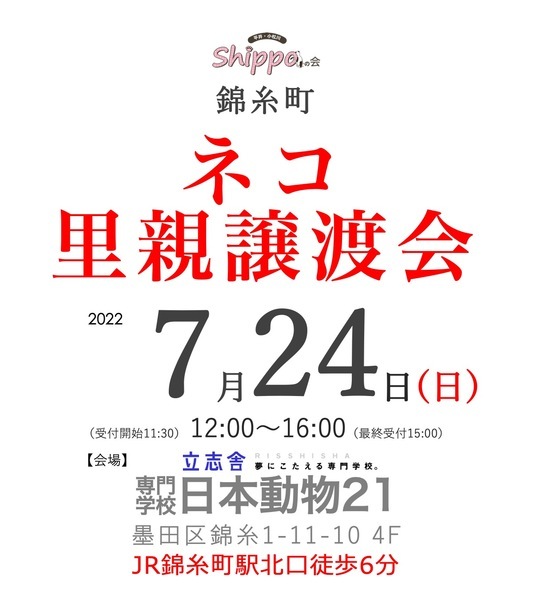| イベント内容 | 東京 錦糸町の専門学校日本動物21様のご協力により、同校舎にて猫の里親譲渡会を開催させていただきます。 〘 お願い 〙 日本動物21様は譲渡会の会場をお貸して頂いているだけですので、里親会・お見合い等に関する一切の問い合わせは受け付けておりません。 ※日本動物21様への電話での問合せはご遠慮ください。 里親会・お見合い・譲渡・掲載している猫等など、全てのお問合せは当会までお願い致します。 hilakoma@yahoo.co.jp 参加猫さんはこちらからご覧下さい。(随時更新) https://www.pet-home.jp/member/user360938/post/ https://omusubi-pet.com/groups/193 ●日時:7月24日(日) 12:00~16:00 (入場受付11:30 最終受付15:00) ●会場:専門学校 日本動物21 墨田区錦糸1-11-10 4F ●アクセス:JR総武線・総武快速線「錦糸町駅」 北口徒歩6分/東京メトロ半蔵門線「錦糸町駅」 3出口徒歩6分 ※東京都墨田区錦糸1-2-1(アルカタワーズ)は同校の法人本部です。 里親譲渡会の会場ではございませんので、お間違いのないよう御願い致します。 感染対策として、ご来場の際は「マスク着用」「入り口でのアルコール消毒」「検温・アンケート・問診票の記入」のご協力をお願いしております。 『三密』を避けるため、以下のように対応させていただきます。 *会場入場者数を制限する場合がございます *窓を開けての外気換気を行いますので、猫さんをケージの外に出すことはできません *会場には待機場所のご用意はございません ご理解いただきますよう、お願いいたします。 子猫ちゃんたちも参加予定なので、小さい頃から一緒に暮らしたい、育てたいとお考えの方、ぜひお越しください! 男性の一人暮らしの方やご高齢の方にもぴったりの、まったりした大人猫さんたちも参加予定です。 里親希望の皆さま、ぜひ、足をお運びください! 猫さんの状況により、当日不参加になる場合があります。 当日ご希望の猫さんを連れて帰ることはできません。 トライアル決定後、後日ご自宅までの送り届けとなります。 ☆譲渡には当会における一定の条件があります。 ☆当会および里親譲渡会についてのお問い合わせ ☆外猫、保護猫のために物資のご支援を頂ける方がおりましたら、送付先をご連絡させていただきますので、ご連絡下さい。 ☆預かりボランティアさん、活動のお手伝いをして頂ける方も随時募集中です。 hilakoma@yahoo.co.jp 当会ブログ https://ameblo.jp/hirakomashippo/ インスタグラム、更新中です https://www.instagram.com/hirakomashippo Twitterやってます〜!! https://twitter.com/hirakomashippo |