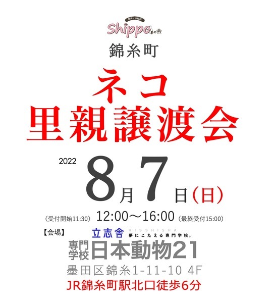 | イベント内容 | 東京 錦糸町の専門学校日本動物21様のご協力により、同校舎にて猫の里親譲渡会を開催させていただきます。 〘 お願い 〙 日本動物21様は譲渡会の会場をお貸して頂いているだけですので、里親会・お見合い等に関する一切の問い合わせは受け付けておりません。 ※日本動物21様への電話での問合せはご遠慮ください。 里親会・お見合い・譲渡・掲載している猫等など、全てのお問合せは当会までお願い致します。 hilakoma@yahoo.co.jp 参加猫さんはこちらからご覧下さい。(随時更新) https://www.pet-home.jp/member/user360938/post/ https://omusubi-pet.com/groups/193 ●日時:8月7日(日) 12:00~16:00 (入場受付11:30 最終受付15:00) ●会場:専門学校 日本動物21 墨田区錦糸1-11-10 4F ●アクセス:JR総武線・総武快速線「錦糸町駅」 北口徒歩6分/東京メトロ半蔵門線「錦糸町駅」 3出口徒歩6分 ※東京都墨田区錦糸1-2-1(アルカタワーズ)は同校の法人本部です。 里親譲渡会の会場ではございませんので、お間違いのないよう御願い致します。 感染対策として、ご来場の際は「マスク着用」「入り口でのアルコール消毒」「検温・アンケート・問診票の記入」のご協力をお願いしております。 『三密』を避けるため、以下のように対応させていただきます。 *会場入場者数を制限する場合がございます *窓を開けての外気換気を行いますので、猫さんをケージの外に出すことはできません *会場には待機場所のご用意はございません ご理解いただきますよう、お願いいたします。 子猫ちゃんたちも参加予定なので、小さい頃から一緒に暮らしたい、育てたいとお考えの方、ぜひお越しください! 男性の一人暮らしの方やご高齢の方にもぴったりの、まったりした大人猫さんたちも参加予定です。 里親希望の皆さま、ぜひ、足をお運びください! 猫さんの状況により、当日不参加になる場合があります。 当日ご希望の猫さんを連れて帰ることはできません。 トライアル決定後、後日ご自宅までの送り届けとなります。 ☆譲渡には当会における一定の条件があります。 ☆当会および里親譲渡会についてのお問い合わせ ☆外猫、保護猫のために物資のご支援を頂ける方がおりましたら、送付先をご連絡させていただきますので、ご連絡下さい。 ☆預かりボランティアさん、活動のお手伝いをして頂ける方も随時募集中です。 hilakoma@yahoo.co.jp 当会ブログ https://ameblo.jp/hirakomashippo/ インスタグラム、更新中です https://www.instagram.com/hirakomashippo Twitterやってます〜!! https://twitter.com/hirakomashippo |