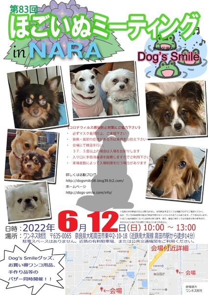 | イベント内容 | 6月12日(日曜日)、奈良県大和高田市のワンネス財団エモーショナルリテラシーセンターにて「第83回ほごいぬミーティングat奈良大和高田」を開催します。 保護犬を家族に迎えようと考えている方、保護犬に会ってみたい方、保護犬について知りたい方、ぜひご来場ください。 相性を見るためなど先住わんこさん、卒業わんこさんのご参加ももちろんOKです。 当日は、Dog's smileグッズやワンコ用品の販売、Dog's smileを応援してくださる方々が手作りされた手作り雑貨などの販売も行います。どれもお買い得です。 また、売り上げは、私たちの活動資金になります。ぜひご協力をお願いします。 来場者のみなさまには、コロナウイルス感染拡大防止に御協力をお願いします。 ・必ずマスクを着用の上、御来場ください。 ・発熱・風邪の症状のある方の入場は御遠慮願います。 ・入口にて検温を行い、37.5℃以上の場合は、入場をお断りします。 ・入場時は、手指消毒への御協力をお願いします。 ・来場者の状況により、入場制限を行う場合があります。 なお、来場予定のワンコについては、活動ブログでご確認ください。 日時 令和4年6月12日(日)午前10時~午後1時 場所 ワンネス財団エモーショナルリテラシーセンター 奈良県大和高田市東中2-10-18 (近鉄南大阪駅高田市駅から南に徒歩14分) 協力 ワンネス財団、株式会社松田電気工業 |