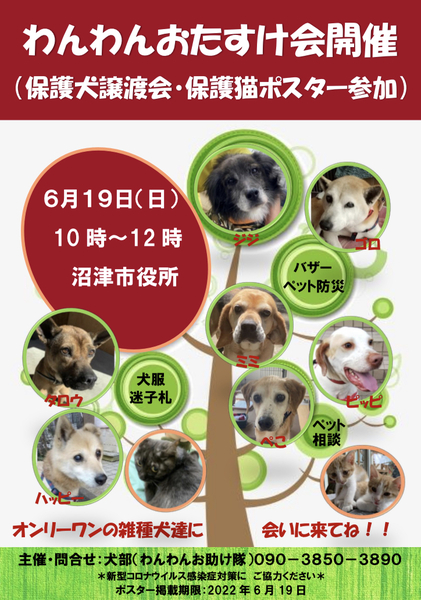 | イベント内容 | 静岡県の沼津市役所にて、保護犬譲渡会を開催します! 【6月わんわんおたすけ会のご案内】 日時:6月19日(日)10時〜12時 場所:沼津市役所(静岡県沼津市御幸町16−1) わんわんおたすけ会は、保護犬猫譲渡会、チャリティバザー、ペット防災啓発、などの犬猫応援イベントです。 里親募集中のワンコたちも参加します。 保護猫はポスターにて里親募集します。 保護犬猫を家族に迎えることを検討されている方、お買い物で支援したいという方、またおたすけ会をのぞいてみたいという方、人もワンコも笑顔満載の会場に是非是非お越しください(^^) 犬部わんわんお助け隊ブログ https://ameblo.jp/inubu11/ 犬部の啓発サイト https://inubuwanwanotasuke.wixsite.com/keihatsu |