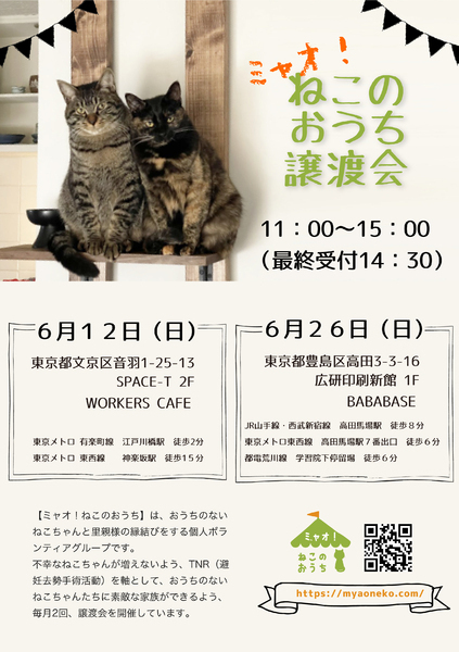 | イベント内容 | 参加する保護猫ちゃんについては、譲渡会一週間前からホームページにてご紹介しております。 https://myaoneko.com 事前予約はできません。 猫ちゃんをお世話することになるご家族皆様でお越しくださると嬉しいです。 譲渡会場でお会いしましょう♪ 【新型コロナウイルス対策について】 会場受付にて、以下の点をお願いする予定です。 ✿マスクの着用 ✿手洗いと消毒 ✿連絡先のご記入 御来場者多数の場合には入場制限を設けさせていただきます。 ※当日沢山のご来場者様がいらっしゃった場合、 整理券をお渡しする事がございます。 会場外で長時間お待たせする場合もございますが ご理解くださいますようお願い致します。 皆さまの長時間の在室を避ける為、 希望者様へは後日のご連絡とさせて頂きます。 ※ 感染防止対策時の特例となります。 ◇譲渡に関してのお願い 【ミャオ!ねこのおうち】では譲渡に際して、以下の要件をお願いしております。 ・完全室内飼いで終生愛育 ・脱走させないための対策 ・不妊去勢手術 ・譲渡誓約書の取り交わし ・医療費の一部ご負担 ※60才以上の方のみのご家庭、独身や、経済的に困難な世帯、 必要な脱走対策を施していただけない方には原則的に譲渡はご遠慮頂いております。 また、保護主により譲渡条件が異なる場合もございますので会場でご相談ください。 参加予定ねこちゃんは、急な体調不良などで不参加になる場合もございます。 【譲渡に関してのお願い】・【医療費の一部のご負担】・【譲渡までの流れ】など 詳しくは下記ホームページをご覧くださいますよう宜しくお願い致します。 ミャオ!ねこのおうち譲渡会 ホームページ https://myaoneko.com |
