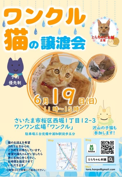 | イベント内容 | とらちゃん本舗 第9回 保護猫譲渡会を開催いたします! 6月19日(日) 11:00~15:00 さいたま市桜区西堀1-12-3 ワンワン広場「ワンクル」 埼京線 中浦和駅 徒歩5分 個人ボランティアが保護している子猫、中猫、成猫様々な世代の子達が沢山参加予定です。 ぜひ足をお運び下さい。 ※当日のお渡しは出来ません。 ・当日咳および発熱の症状のある方はご来場をご遠慮ください。 ・ご参加の際はマスクの着用・アルコール消毒にご協力をお願いいたします。 ・入場前に検温をさせていただき、37.5℃以上の方はご参加いただけません。 ・事前予約優先制になります。 ※当日猫ちゃんの体調によりお休みになる子がおります。 前日blogにてお知らせいたします。 ※譲渡にはお願いごとがございます。譲渡条件をご確認下さい。 https://ameblo.jp/torachan-adp/entry-12717827948.html ご予約はこちらまで tora.honpo@gmail.com 以下の点を添えてお申し出ください。 ・お名前・人数 ・希望時間帯 (①11:00~②12:00~③13:00~④14:00~) ・会いたい猫がいれば猫の名前など |