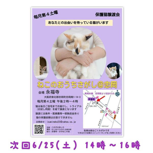 | イベント内容 | ※感染拡大の状況によっては急遽中止となる場合もございますので、お越しになる前にブログの確認をお願いします ☆里親希望申込は先着順ではありません☆ 里親会終了後に検討させていただきますので、分散してご見学くださいますようご協力お願いします ボランティアの元でケアされた保護猫さん達がずっとのおうちを探しています 保護猫を家族に迎え入れる選択肢をご検討いただけませんか? 第6回ねこのおうちさがし@忠岡 開催日 : 2022年6月25日(土) 時間 : 午後2時~4時 場所 : 永福寺 大阪府泉北郡忠岡町忠岡南1丁目14−3 南海本線忠岡駅より徒歩約5分 参加猫紹介ブログ https://www.izumineko22.com ☆会場へのお問い合わせは固くお断りします。 ★譲渡には完全室内飼育、同意書への署名・捺印などの条件、医療費等の一部負担があります。 ★猫さんは、後日お届けとなります。 当日連れて帰ることはできません。 ★参加予定の猫さんは、里親会の前に里親さまが決定する場合や、体調により不参加となる場合があります。 主催:この子のあした 運営:ねこのおうちさがし和泉支部 協力:永福寺・さのねこの会 お問い合わせはメールまたはLINEにてお願いします izumineko22☆yahoo.co.jp ☆を@にしてください https://lin.ee/A6fvoVL LINEの方は↑のURLをクリックしてください |