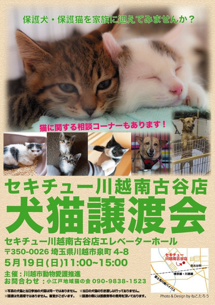 | イベント内容 | この度、セキチュー川越南古谷店で保護犬と保護猫の譲渡会が開催されます。 これから犬や猫のお迎えを考えている方、この機会に保護犬・保護猫のお迎えを考えてみてくださいませんか? 是非お待ちしております! ※雨天決行です 【日時】5月19日(日)11:00~15:00 【場所】セキチュー川越南古谷店 エレベーターホール 【住所】〒350-0026 埼玉県川越市泉町4-8 【アクセス】 JR埼京川越線 南古谷駅下車 徒歩7分 お車でお越しの場合、セキチューの駐車場が使用できます。 https://www.sekichu.co.jp/shop/kawagoe/ ※※注意事項※※ ①譲渡は先着順ではありません。審査がございます。 ②猫の当日の引き渡しを行っておりません。後日お届けになります。 ③譲渡条件がございます。詳しくは譲渡会にてご説明いたします。 (譲渡条件は団体により異なります。) |