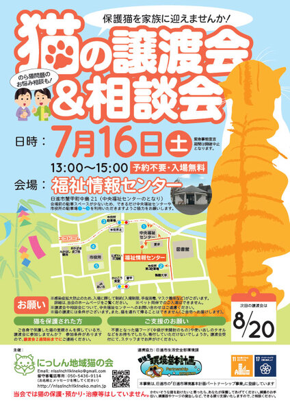 | イベント内容 | 7月16日(土)に「猫の譲渡会」を開催いたします。 猫少なめのミニ譲渡会&相談会です。 保護猫を迎えたい方はもちろん、ご近所との猫トラブルなどでお悩みの方もお気軽にお立ち寄りください!(^^)/ 【日時】2022年7月16日(土)13:00〜15:00 【会場】福祉情報センター(中央福祉センターとなり) ※入場無料・予約不要です。 ※緊急事態宣言中は開催中止となります。 ※感染症拡大防止のため、入場に際して制約がございますので、ご理解・ご協力をお願いいたします。詳細は、ホームページにて随時更新いたします。 ※会場前に駐車場がございますが、数が少ないため、できる限り中央福祉センターか日進市役所の駐車場をご利用ください。図書館向かいにも市役所の臨時駐車場がございます。 ※ペット同伴のご入場はできませんので、予めご了承ください。 ※感染症拡大防止対策として、室外でお待ちいただく場合や室内換気のため冷暖房が効きにくいことがございます。 ※猫ちゃんの譲渡には条件がございます。詳細はホームページをご参照ください。 【主催】にっしん地域猫の会 【ホームページ】http://nissinchiikineko.main.jp |