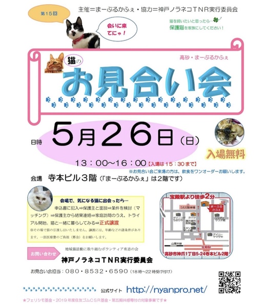| イベント内容 | 会場 :寺本ビル3階(まーぶるかふぇは2階です) 高砂市神爪1丁目5-24 アクセス 山陽本線 宝殿駅より徒歩2分 駐車場はございません。近隣の℗をご利用ください。 *ご来場の方は飲食をワンオーダーお願いします。 神戸ノラネコTNR実行委員会のメンバーや協力ボランティアさんたちは、不幸な命の誕生を防ぐ活動(=TNR)とともに、今ある命を救済する活動(=猫を保護、預かっておうちを探す譲渡活動)にも力を入れています。 1匹でも多くの保護猫が新しい家族と出会い、ずっと暮らせるようにご縁をつなぐ「猫のお見合い会」の西部拠点・保護猫カフェ「まーぶるかふぇ(Marble CAFE)」(高砂市神爪)で、2018年4月から、毎月定期開催しています。 慣れている猫は触ったり、抱っこもしたりして触れ合いながらのお見合いができます。ぜひお立ち寄りください。 当日の猫の引き渡しはしておりません。 必ずご自宅にお届けします。 年齢等の条件がございます。詳しくはスタッフにお尋ねください。 医療費などの一部負担をお願いします。 主催 まーぶるかふぇ 協力 神戸ノラネコTNR実行委員会 |