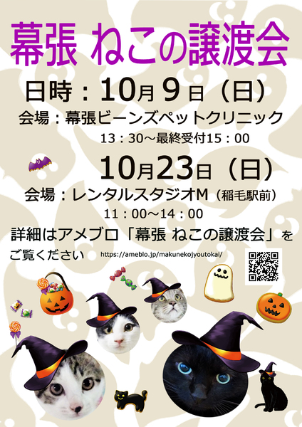 | イベント内容 | 幕張ねこの譲渡会は千葉県内で活動している個人ボランティアさんが集まり 開催している譲渡会です。 TNR活動中で保護したねこ達や、棄てられて行き場を失ったねこ達、 多頭崩壊現場やセンターからレスキューしたねこ達に お家をみつけてあげるべく、月に2回譲渡会を開催し ずっとのお家探しをしています。 年間約150匹のねこたちが幕張ねこの譲渡会を卒業しています 1匹お迎え頂けるとまた次のねこちゃんを保護する事が出来ます ぜひペットショップでは無く保護猫ちゃんを迎えるという選択を! 新しい小さな家族に出会いにぜひいらして下さい 近隣の方もそうでない方も、お待ちしています *開催日 令和4年 10月9日(日) 13:30より16:00 最終受付15:00 (午前の診察が終わり次第設営です) 時間内、ご都合のよろしいお時間にご来場下さい 混み合った場合は整理券を発行させて頂きます 会場内の人数を調整しての開催となります 申し込みたいねこちゃんや、 気になるねこちゃんが既にいる場合、 事前にアンケートをご記入頂きお送り頂けますと 当日が時短となり助かります どうぞご協力の程よろしくお願い致します 「アメブロ 幕張ねこの譲渡会 譲渡会参加お申込みはコチラ」 https://ameblo.jp/makunekojyoutokai/entry-12632582368.html よりアンケートをご送付下さい。 (譲渡会会場でお見合い後にお申込みとなった際には 別途申し込み用紙のご記入をお願いしております。 お手数をお掛け致しますがどうぞご了承下さい) *会場 幕張ビーンズペットクリニックさん http://www.m-beans.com/ 〒262−0032 千葉市花見川区幕張町5−417−135 周辺交通機関 JR総武線「幕張」駅より南へ徒歩8分 JR京葉線「海浜幕張」駅より北へ徒歩13分 駐車場は病院駐車場5台あります。詳細はコチラをご覧下さい。 http://www.m-beans.com/parking.html 近隣コインパーキング有(有料) 譲渡会のお問い合わせは「幕張ビーンズペットクリニック」さんでは無く、 こちらにお願い致します makunekojyoutokai★★★@gmail.com (★★★を@に変えてお送り下さい) ★譲渡の流れ及び譲渡条件はコチラです 必ずご覧下さい https://ameblo.jp/makunekojyoutokai/entry-12301780427.html 「家族の一員」としてお迎え頂ける方」「家族」としてお迎え頂ける方 命のバトンタッチを、どうぞよろしくお願い致します 新しい小さな家族に出会いにいらっしゃいませんか? 皆様のご来場をスタッフ一同心よりお待ちしています。 |