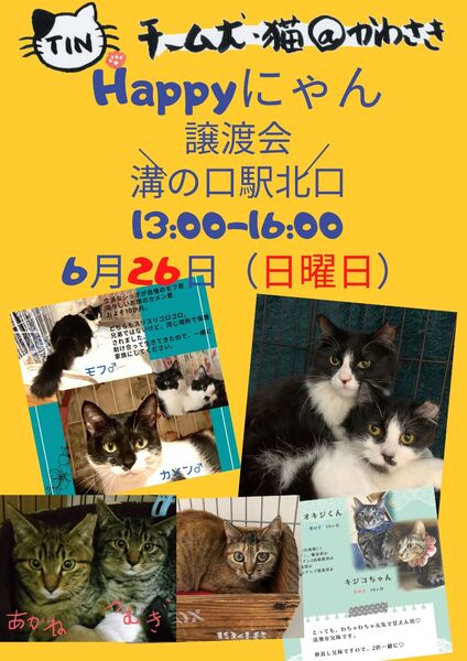 | イベント内容 | チーム犬・猫@かわさき 川崎市動物愛護センターに登録している個人ボランティアの集まりです。 毎月第2・4日曜日に溝の口駅北口ペデストリアンデッキにて、 TNR時に保護した子や愛護センターから引き出した子たちの譲渡会を開催しています。 ※ポスターの子たちは現在当会で家族募集中の猫さんたちですが、今回の譲渡会に参加するか否かはまだ決まっていません。 当日参加する予定の猫達や募集中の猫さん達についてや、 譲渡条件や譲渡の流れなどの詳細は ホームページ https://aipet.blog.jp/ インスタグラム https://www.instagram.com/team.inuneko.kawasaki/ をご確認ください。 |