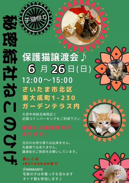| イベント内容 | 明日!6月26日は! 秘密結社ねこのひげ保護猫譲渡会♪ ✼••┈┈••✼••┈┈••✼ 埼玉県さいたま市北区東大成町1-230 ガーデンテラス内 開催時間12:00~15:00 ✼••┈┈••✼••┈┈••✼ 月齢2~3ヶ月の仔たち20頭ほどが♪ 未来のご家族様に見つけて貰うのを 今か今かと待っております♡ ミルクから育てた仔から ママンが福福と育て上げた仔まで♪ みんにゃ人慣れ花丸♡ みんにゃ性格花丸♡ みんにゃ元気なちびっ子ギャングです(笑) 元仔猫なモフっとしたオトナっ仔も♪ オトナの魅力ムンムンでお待ちしてます♡ 家族にするなら保護猫でしょ♪ と、妄想が止まらない方のご来場を 心からお待ちしてます♪ ワク♪o(・ω・o)(o・ω・)oテカ♪ ●参加メンバー(インスタ) @chotocha @kuro_mamegram @nanashin.3 @miko_manma 夜なべ物販も開催します♪ @yonayona2222 お気軽にお立ち寄り下さいませ☆ |
