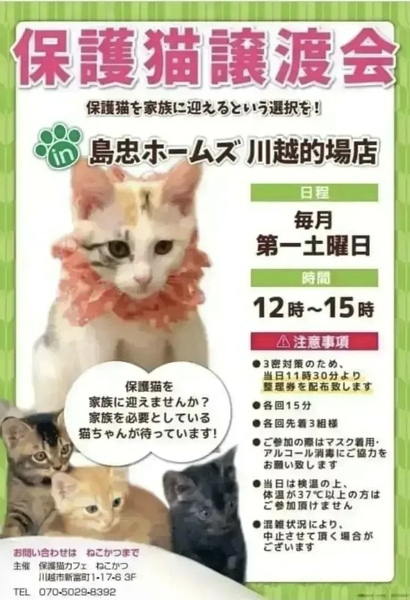 | イベント内容 | 毎月第一土曜日に、保護猫カフェ「ねこかつ」主催の譲渡会を開催しています。 子猫から成猫まで沢山の猫達が参加予定です。 【注意事項】 ・3密対策のため、当日11時30分より整理券を配布いたします。 ・各回先着3組様、15分間ご入場いただけます。 ・マスク着用、アルコール消毒のご協力をお願いいたします。 ・当日は検温の上、体温が37℃以上の方はご参加いただけません。 ⌒*。*゚*⌒*゚*。*⌒*。*゚*⌒* ゚*。*⌒*。*゚ 店舗には、ご寄付ボックスを常設していただいています。 こちらへ入れられたご支援品は、保護猫達の為に使わせていただきます。 何卒よろしくお願いいたします。 ⌒*。*゚*⌒*゚*。*⌒*。*゚*⌒* ゚*。*⌒*。*゚ たくさんの素敵なご縁がありますように♪ お問い合わせは下記まで♪ ーーーーー 保護猫カフェねこかつ Tel:070-5029-8392 ーーーーー |