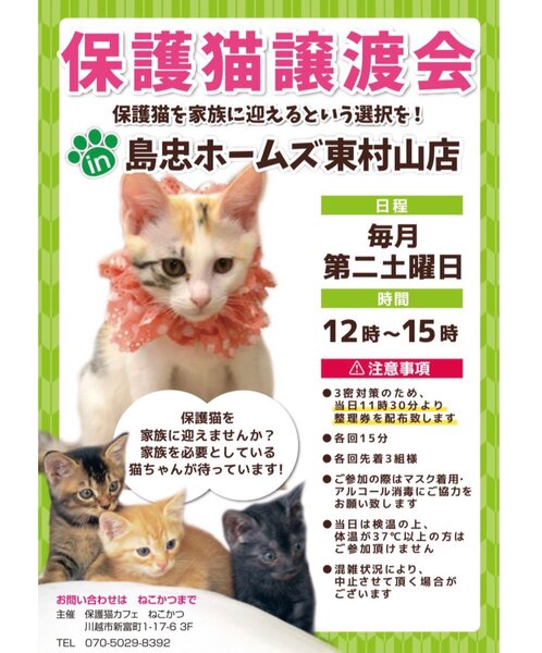 | イベント内容 | 毎月第ニ日曜日に、保護猫カフェ「ねこかつ」主催の譲渡会を開催しています。 子猫から成猫まで沢山の猫達が参加予定です。 【注意事項】 ・3密対策のため、当日11時30分より整理券を配布いたします。 ・各回先着3組様、15分間ご入場いただけます。 ・マスク着用、アルコール消毒のご協力をお願いいたします。 ・当日は検温の上、体温が37℃以上の方はご参加いただけません。 ⌒*。*゚*⌒*゚*。*⌒*。*゚*⌒* ゚*。*⌒*。*゚ 店舗には、ご寄付ボックスを常設していただいています。 こちらへ入れられたご支援品は、保護猫達の為に使わせていただきます。 何卒よろしくお願いいたします。 ⌒*。*゚*⌒*゚*。*⌒*。*゚*⌒* ゚*。*⌒*。*゚ たくさんの素敵なご縁がありますように♪ お問い合わせは下記まで♪ ーーーーー 保護猫カフェねこかつ Tel:070-5029-8392 ーーーーー |