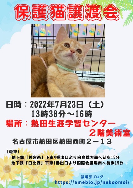| イベント内容 | 保護猫譲渡会! 名古屋市熱田区 熱田生涯学習センター2階 美術室にて開催します。 子猫達も参加します♬ 小さな子猫は もちろん可愛いですが 少し育った若猫、性格が安定した大人猫も ずっとのおうちを探しています。 個人保護主が集まって共同開催しております。 譲渡条件などは 個々の保護主よりますので 気になる猫さんがいましたら お気軽に保護主にお尋ね下さい。 (^-^) さ ご来場の際 マスクの着用をお願い致します。 マスクはご来場者様でご用意下さい。 希望者の方には アンケート記入をお願いしております。 アンケートを元に お話しをさせて頂きます。 当日 猫を連れて帰る事は出来ません。 お車でお越しの場合 施設駐車場 (300円/1日)もしくは 近隣のコインパーキング(有料)をご利用下さい。 路上駐車は 近隣住民のごさ迷惑になりますのでおやめください。 譲渡会会場はお借りしているだけですので 会場へのお問合せはご遠慮下さい。 |