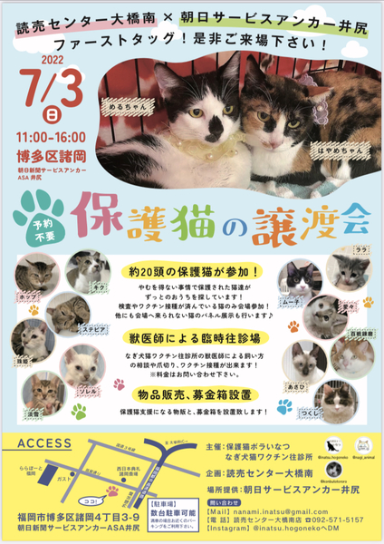 | イベント内容 | 猫のためのコラボ譲渡会! 7/3(日) 11:00〜16:00 【場所】朝日サービスアンカーASA井尻店 【住所】博多区諸岡4丁目3-9 【駐車場】4〜5台駐車可 満車の場合は最寄りのパーキングを ご利用お願い致します? 保護猫ボラいなつからは 子猫6匹 成猫5〜7匹 参加予定です! 個人ボランティアとして @rosita.maki さんの所の 源ちゃん?⬛ @konbutotororo さんの保護猫 キクちゃん?⬛ が参加いたします! 他にも今回はなぎ犬猫ワクチン往診所の先生から団体さんに声をかけてもらいまして、 参加頭数がいっぱいとなりますので、参加猫ちゃんの受付は終了致します?♀️ うみねこさん @umineko.111 子猫を午前と午後の部で分けて沢山参加の予定です! ねこ善さん @nekozen_kurume 5匹の猫ちゃんが参加いたします! リアンさん @lien.chikugo 頭数は当日のお楽しみ?! 募集中の猫たちの投稿を是非ともチェックして下さい! . 今回の譲渡会には、なぎ先生繋がりで 不動産屋さんにもご参加頂きます! 福岡県内、場合によっては県外も?! 猫可物件の相談や、その他の物件の相談事なども 気軽にお越しいただきお話が可能です! . . FIP発症の2匹、チャーリーとべべのための 募金箱を設置致します! また、物販もありますので、お気軽にお越し下さいませ . 臨時往診所にて ワクチン接種、爪切り、飼い方相談等行いますのでお気軽にお越し下さいませ。 |