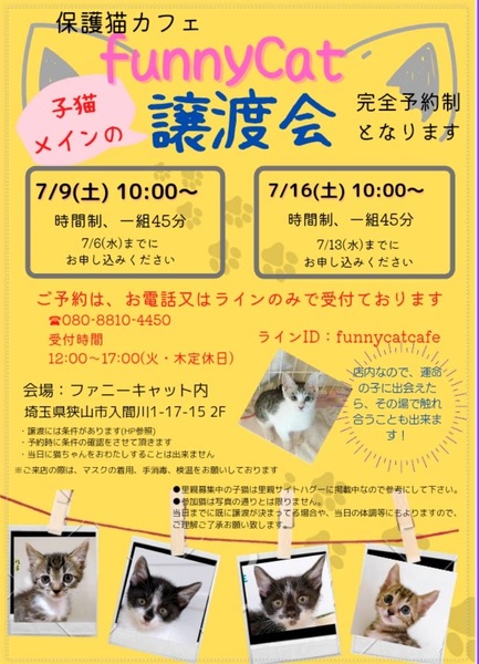 | イベント内容 | ?7/9(土)7/16(土) 子猫メイン譲渡会開催? 予約制のため、入場はご予約頂いた方のみになります✨ ★日時★ 7/9(土)←7/6(水)までにご予約下さい。 7/16(土)←7/13(水)までにご予約下さい。 10:00〜10:45 11:30〜12:15 13:00〜13:45 14:30〜15:15 1組の人数により 同時間内のご案内可能な組数は異なります。 既に枠が埋まってしまっている場合にはご希望のお時間でご案内が出来ない可能性もございます。 ★参加条件★ 完全予約制のため 予約必須 ★会場★ 狭山ファニーキャット内 埼玉県狭山市入間川1-17-15 2階 駐車場はありません、近隣のパーキングご利用下さい。 スリッパに履き替えていただくので靴下着用お願いします。 ★ご予約★ お電話かLINEでのお申込み ☎️電話 08088104450 (電話受付時間12:00〜17:00)火曜木曜は定休日となります ?LINE ?funnycatcafe 譲渡には条件がございます、ご予約の際にもご確認させていただきます。 参加猫は写真の通りとは限りません。 既にお声がかかっている場合や当日の体調等にもよりますので、ご理解ご了承お願い致します。 ご来店の際には、マスク着用、手指消毒、検温にもご協力お願い致します! ご予約&ご縁お待ちしております?⬛✨ |