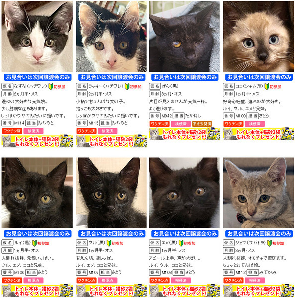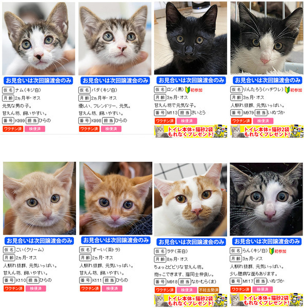 | イベント内容 | 今夏最大の子猫まつりは30匹!!まだ増える? 猫・猫・猫づくし!子猫が主役の譲渡会です。 写真撮りと掲載が追いつきません( ;∀;) http://miyoshineko.sblo.jp/article/189673172.html ▼ちっちゃな譲渡会・子猫まつり第3弾 7月24日(日)/10時~15時 三好ヶ丘カリヨンハウスイベント広場(冷房完備) 愛知県みよし市三好丘2-2-1 *無料駐車場48台、近隣に大型コインPあり 【ご来場前にお読みください】 体調不良で急遽不参加になる猫もございます。 子猫まつりは大変混み合います。 来場者多数の場合は入場制限を行う場合があります。 猫は早いもの勝ちではございません。 すべての希望者とお話しをしてトライアル先は抽選で決まります。 当選された方のみ担当者からご連絡を差し上げます。 <譲渡までの流れ及び譲渡手数料> ◆三好ネコの会保護猫 http://miyoshineko.sblo.jp/article/187085341.html ◆個人の保護猫 保護主様によって譲渡基準、手数料、ワクチン代、治療費が異なります 譲渡会場でご確認ください。 (=^・^=)(=^・^=)(=^・^=)(=^・^=)(=^・^=)(=^・^=) ●amazon欲しいものリストからご支援お願いします。 https://www.amazon.co.jp/hz/wishlist/ls/2ISUJLV6D472X?ref_=wl_share ●主催:NPO法人三好ネコの会 http://miyoshi-neko.jp |