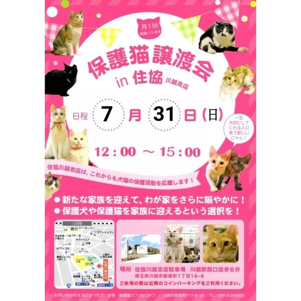 | イベント内容 | 毎月1回、保護猫カフェ「ねこかつ」主催の譲渡会を開催しています。 子猫から成猫まで沢山の猫達が参加予定です。 【注意事項】 ・マスク着用、アルコール消毒のご協力をお願いいたします。 ・雨天の場合は室内に変更となります。 ・お車でお越しの場合は近隣のコインパーキングをご利用下さい。 たくさんの素敵なご縁がありますように♪ お問い合わせは下記まで ーーーーー 保護猫カフェねこかつ Tel:070-5029-8392 ーーーーー |