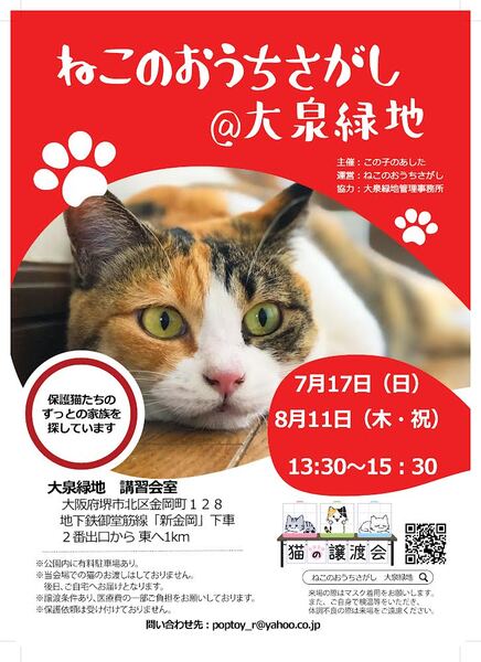 | イベント内容 | 密になりにくい広い会場で、 今回も子猫ちゃん〜大人猫ちゃんまで多数参加します♪ 参加猫ちゃんたちについては、順次ブログにてご紹介していきます(^^) https://ameblo.jp/jillrill/theme-10113120111.html ※感染拡大の状況によっては急遽中止となる場合がございます。 ※ご来場の際は必ずマスク着用をお願いいたします。 ※開催時間中、定期的に空間中に消毒液を噴霧いたしますので、あらかじめご了承ください。(無害です) 第12回☆ねこのおうちさがし@大泉緑地 日時 : 2022年7月17日(土) 時間 : 13:30〜15:30 場所 : 大泉緑地 講習会室 〒591-8022 大阪府堺市北区金岡町128 地下鉄御堂筋線「新金岡」2番出口より東へ1km ☆公園内に有料のコインパーキングがございます。 (第1駐車場が会場に一番近いです) ☆会場へのお問い合わせは固くお断りします。 (場所をご提供くださるだけなので、参加猫のについてはご存知ありません) ★譲渡には完全室内飼育、同意書への署名・捺印などの条件、医療費の一部負担があります。 ★猫ちゃんは、後日お届けとなります。 当日連れて帰ることはできません。 ★参加予定の猫ちゃんは、里親会の前に里親さまが決定する場合や、体調により不参加となる場合があります。 主催:この子のあした 運営:ねこのおうちさがし 協力:大泉緑地 問い合わせ先 : poptoy_r☆☆☆yahoo.co.jp (☆☆☆を@に変更してください) ※スジュールにより来場できないけど気になる子がいらっしゃる場合、お問い合わせ頂きましたら、アンケートにお答え頂いたのち保護主さんにお繋ぎいたします。 |