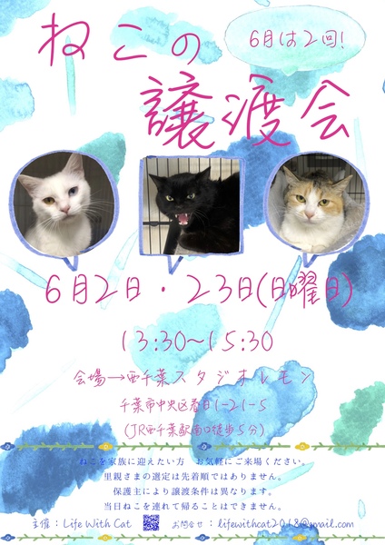 | イベント内容 | 個人ボラさんが愛情をかけて保護している大きな猫ちゃんや小さな猫ちゃんたちが ずっとのお家を求めて集まります。 ねこを家族に迎えたいとお考えの方 会場はアットホームな雰囲気ですので どうぞお気軽にご来場くださいね。 *里親さまの選定は先着順ではありません。 *保護主により譲渡条件は異なります。 *当日ねこちゃんを連れて帰ることは出来ません。 後日 保護主が里親様宅へお届けいたします。 *里親様に医療費のご負担をお願いしております。 第14回 Life With Cat『ねこの譲渡会』 6月23日(日曜日) 13:30~15:30 <会場> レンタルスタジオレモン 260-0033 千葉市中央区春日1丁目21-5 (JR西千葉駅/京成西登戸駅より徒歩4分) *駐車場のご用意はございません。 スタジオより徒歩1分圏内にコインパーキングが多数ありますので そちらをご利用ください。 ブログ→https://ameblo.jp/lifewithcat2018/ Facebook→https://www.facebook.com/lifewithcat2018/ メールでのお問い合わせ→lifewithcat2018@gmail.com |
