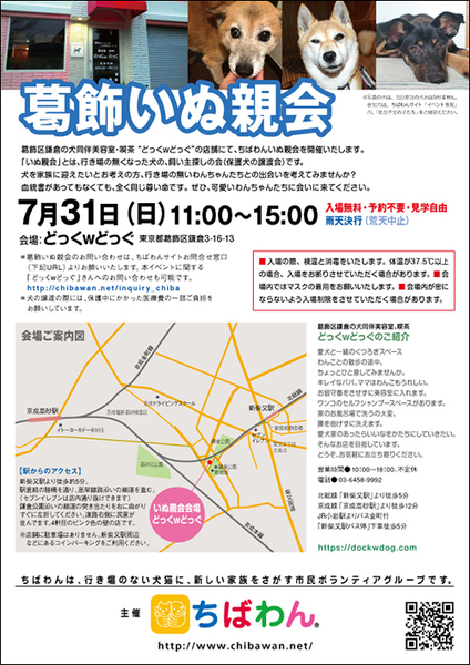 | イベント内容 | 葛飾区鎌倉のいぬ同伴美容室・喫茶“どっくwどっぐ”の店舗にていぬ親会を開催します。 可愛い保護わんこたちが新しい家族との出会いを求めて参加します!! いぬ親会見学は予約等必要ありません。 是非、ご家族同伴でご来場下さい。 【ちばわんからのお願い】 ①会場内ではマスクの着用をお願いします。 ②入場の際、検温と消毒をいたします。体温が37.5℃以上の場合、入場をお断りさせていただく場合があります。 ③会場内が密にならないよう入場制限をさせていただく場合があります。 開催日:7月31日(日)11:00~15:00 室内開催 雨天決行 場所: どっぐwどっぐ 東京都葛飾区鎌倉3-16-13 《アクセス》 【駅からのアクセス】 新柴又駅より徒歩約5分。 駅直結の陸橋を通り、高架線路沿いの細道を進みます。 (セブンイレブンは店内通り抜けできます) 鎌倉公園沿いの細道の突き当たりを右に曲がりすぐに左折してください。 道路右側に民家が並んでいます。4軒目のピンク色の壁の店です。 ※店舗に駐車場はありません。 当日お車の方はコインパーキングをご利用ください。 《注意事項》 【当日の流れ】 (1)家族募集中のいぬとお会いになりたい方はどなたでも自由にご参加いただくことができます。ちばわんボランティアは名札をつけておりますので、ご遠慮なくお声をかけて下さい。また、募集中のいぬのそばには預かりボランティアが控えておりますのでいぬの性格や生活習慣など、遠慮なくご質問ください。 (2)ご希望のいぬが決まったら、お申し込みアンケートにご記入の上、ボランティアにお渡し下さい(前日までにメールでアンケートを送信してお申し込みいただくこともできます。) ◆「いぬ」アンケート送信先:http://chibawan.net/contactform_dog (3)アンケート内容を拝見し、お話させていただきます。 (4)原則として一両日中にお返事の連絡をさせていただきます。 (5)ご縁が成立した場合には、後日、こちらからご自宅までいぬをお届けし、約1ヶ月のお試し生活に入っていただきます。お届けの際に、書面での譲渡契約書を交わします。 ※ワクチン・不妊手術代など保護犬にかかった費用は、家族になるいぬ親さんにもご負担をお願いしています 《お知らせ》 会場ではチャリティグッズを販売します 売上金は保護した犬猫の医療費など、 ちばわん活動費として大切に使わせていただきます 《お問い合わせ》 いぬ親会について:http://chibawan.net/inquiry_dog_other ※いぬ親会当日はメールが見られません。また、お問い合わせの際は、必ず「具体的な件名」を入れて多数の迷惑メールと区別がつくようにお願いいたします。 葛飾いぬ親会イベントページ https://chibawan.net/event/20220731katsushika-dog ちばわんホームページ https://chibawan.net/ |