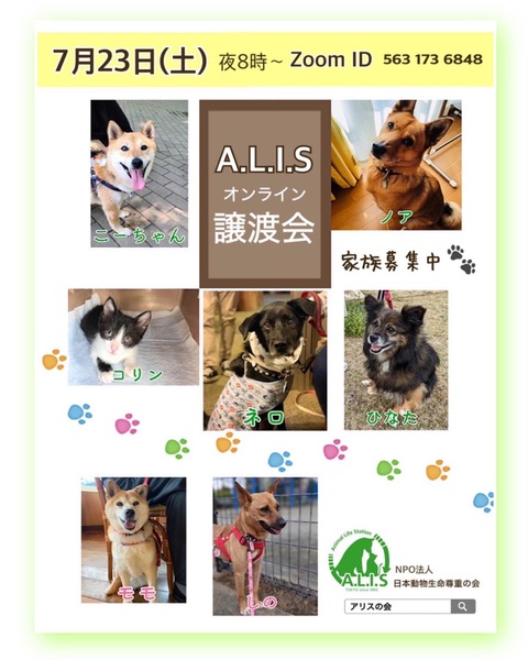 | イベント内容 | オンライン譲渡会のお知らせ 7月23日(土)午後8時より、オンライン譲渡会を開催いたします 皆さまのご参加お待ちいたしております 午後7時45分よりzoomはオープンいたしますので、お時間になりましたら ゲストの皆さまは zoomID563 173 6848 を入力し順次お入りください IDno.は7月23日(土)当日のみ有効になりますので、ご注意をお願いいたします 当日はモモ・ノア、しの、ひなた、ネロ、こーゃんの参加予定ですが お見合いや体調等で参加を見合わせることもございます 予め、ご了承をお願いいたします *~~*~~*~~*~~*~~*~~*~~*~~*~~*~~*~~* ご参加いただきましたら、マイクをミュートに設定してください 発言される時は、ミュートをオンにしてお話しください zoomでお顔出しNGの場合、ご参加いただいてから『ビデオの停止』をオフにされますと お名前だけの表示になります 詳しくはホームページ「オンライン譲渡会のお知らせ」をご覧ください *ご質問は、ホームページトップより直接メールにてお問い合わせください |