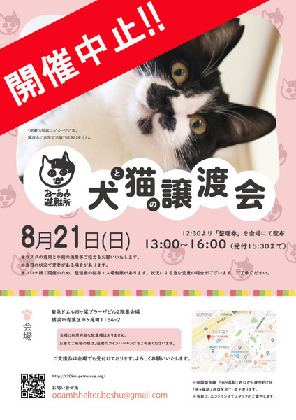 | イベント内容 | ☆★☆★☆★☆★☆★☆★☆★☆★☆★☆★☆ ~8月21日(日)市ヶ尾譲渡会中止!~ 予定しておりました会場を、 借りることができなくなりましたため、 譲渡会は中止となりました。 あたたかいご理解を賜りますよう よろしくお願い申し上げます。 ☆★☆★☆★☆★☆★☆★☆★☆★☆★☆★☆ |