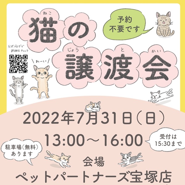 | イベント内容 | ねこの譲渡会 in 宝塚 https://ameblo.jp/takarazuka-tnr/ 生体販売を中止したペットショップさん全面協力の元、 保護ねこ達の幸せを繋ぐ譲渡会を開催いたします。 20匹を超える猫たちが参加します。ぜひ猫たちに会いに来て下さい。 【日時】 2022年7月31日(日) 13時~16時(受付は15時半まで) 【場所】 ペットパートナーズ宝塚店 JR福知山線『中山寺』駅より徒歩約10分 兵庫県宝塚市長尾町1-14 ※駐車場あります。 【予約不要】 直接会場へお越し下さい。 【同時開催】チャリティー・フリーマーケット 掘り出し物がみつかるかも!? お気軽にお越し下さい。 売上はすべて猫を猫を救う活動に使わせて頂きます。 【ドネーション・ビン設置】ご協力お願いいたします。 ★ドネーション・ビンとは…?海外のペットショップには必ず設置されている寄付箱の事。 ご家庭で使わない首輪やペットグッズ、トイレ砂やペットシーツ、ペットフード(未開封に限る) などのご寄付を入れて下さい。 保護猫達の為に、大切に使わせて頂きます。 【お知らせ】 ★ご年配の方には、「一時預かり制度」「終生預かり制度」など、 飼育して頂けるプランをご用意していますのでご相談下さい。 【ご注意事項】 ※ 譲渡は先着順ではありません! すべての方の見学が終わってから猫達にいちばん合う里親様を 決定致します。 【主催】 特定非営利活動法人 TNR宝塚 【協力】 ペットパートナーズ宝塚店 【後援】 宝塚市 【問合せ】 kaizaru7★yahoo.co.jp(★を@に変えて下さい) |