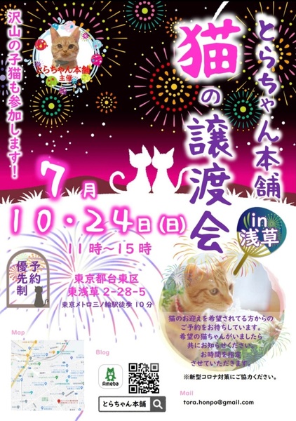 | イベント内容 | とらちゃん本舗 第14回 保護猫譲渡会を開催いたします! 7月24日(日) 11:00~15:00 東京都台東区東浅草2-28-5 東京メトロ 三ノ輪駅 徒歩10分 個人ボランティアが保護している子猫、中猫、成猫様々な世代の子達が沢山参加予定です。 ぜひ足をお運び下さい。 ※当日のお渡しは出来ません。 ・当日咳および発熱の症状のある方はご来場をご遠慮ください。 ・ご参加の際はマスクの着用・アルコール消毒にご協力をお願いいたします。 ・入場前に検温をさせていただき、37℃以上の方はご参加いただけません。 ・事前予約優先制になります。 ※当日猫ちゃん・ワンちゃんの体調によりお休みになる子がおります。 前日blogにてお知らせいたします。 ※譲渡にはお願いごとがございます。譲渡条件をご確認下さい。 https://ameblo.jp/torachan-adp/entry-12717827948.html ご予約はこちらまで tora.honpo@gmail.com 以下の点を添えてお申し出ください。 ・お名前・人数 ・希望時間帯 (①11:00~②12:00~③13:00~④14:00~) ・会いたい猫がいれば猫の名前など |